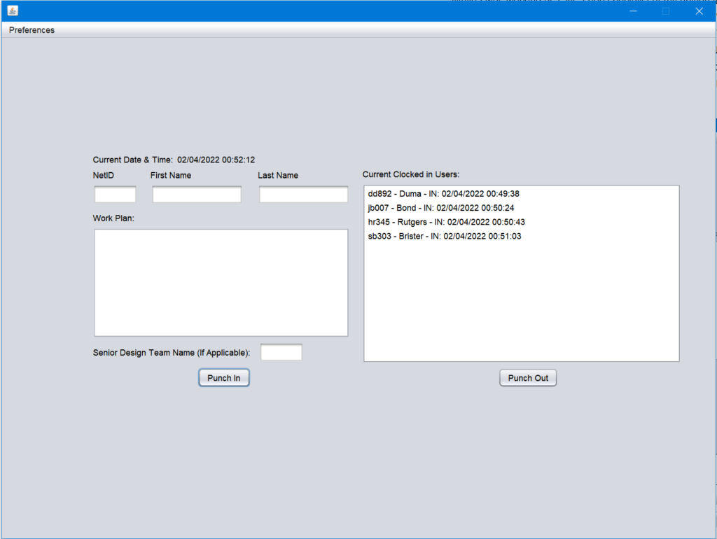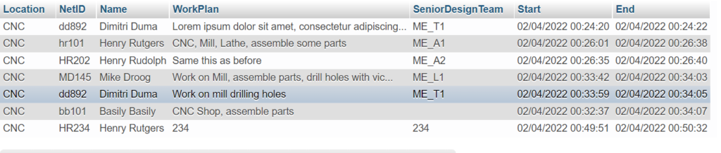 While I was working as CNC shop specialist at my university, I was assigned to create a sign in system for the machine shops. A simple google document setup could’ve worked – but I wanted to practice my coding skills and learn how to connect java and online databases. Turns out it is a lot simpler than I thought! The client is coded in Java and uses the Java Swing API for GUI creation. The GUI was created in the NetBeans IDE as it is easy to iterate GUI elements as it is drag and drop. The requirements were to record the students name, their NetID, a work plan the student plans to do, and a field for the students senior design team if applicable. The data is then recorded and a list of currently clocked in students are temporarily stored and displayed. This is helpful information for the shop monitors to quickly know how many students are currently using the shops (at the time of writing, the school had a limit on students in a room due to the COVID-19 pandemic). When the user punches out, the data is then appended to the MySQL database using the JConnector API. In case a user were to forget to punch out of the machine shop, all currently clocked in users are clocked out at the shop close time and appended to the database. This system was designed to be as foolproof and easy to use. For example, a user can not punch in unless all important fields are filled, and an error modal will pop up explaining the error. In the case a connection to the database can not be found, the data is stored locally on a csv file that can be uploaded when a connection is re-established. This was a fun little project that did not take as long as I thought it would and is currently deployed on several machines at Rutgers University.